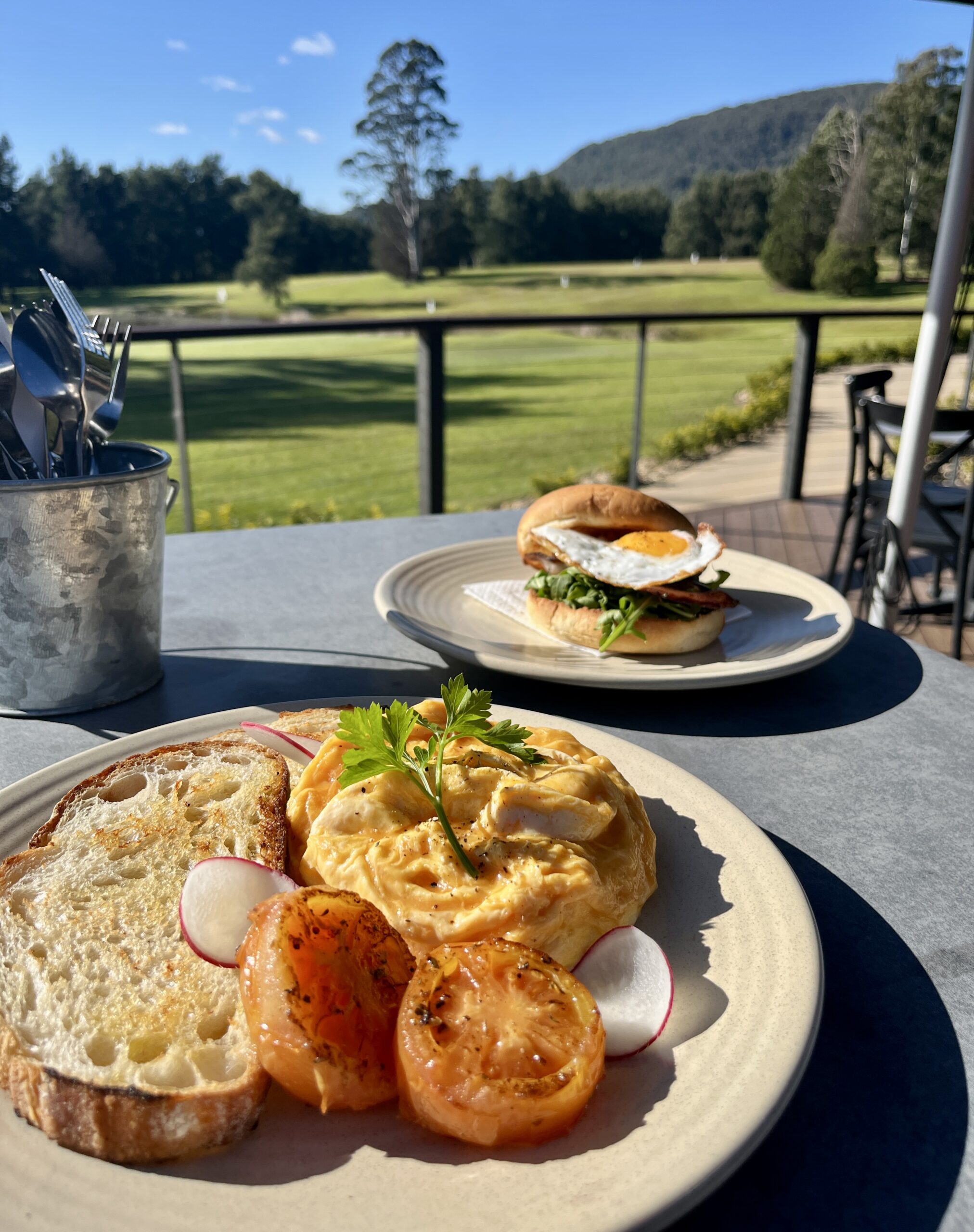 Served with sourdough, bacon, hash brown, roasted tomatoes and mushrooms.